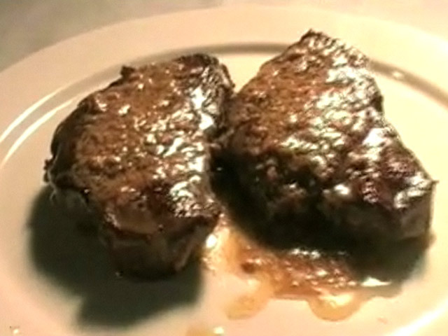 Рецепт приготовления мяса с лимоном и маслом.Состав:филе — 2 куска;сок одного лимона;сливочное масло — 50 гр;черри — 5 штук;фуа-гра, масло, соль.