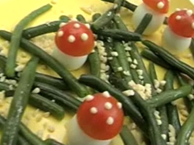 Мини-меню из фасоли.Состав:стручковая фасоль — 10 стручков;перепелиные яйца — 3 штуки;помидоры черри — 4 штуки;тертый миндаль;соль, оливковое масло, майонез.