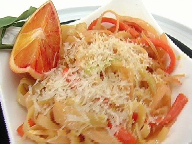 Сытная паста с оригинальной апельсиновой заправкой.Состав:сок одного апельсина;паста — 250 гр;лук — 1 пучок;морковь — 1 штука;чеснок — 1 головка;сыр — 100 гр;соль, оливковое масло — по вкусу.