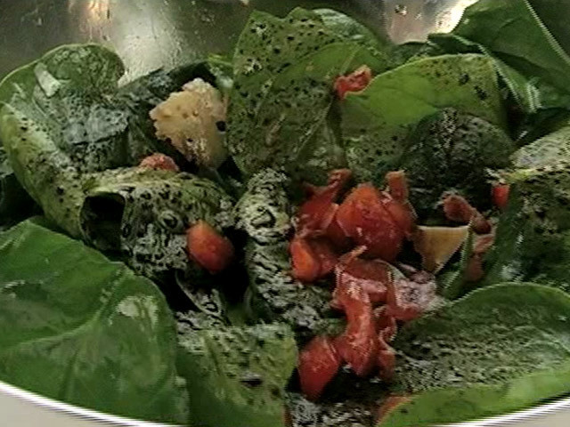 Вкусное и простое блюдо из шпината.Состав: бекон — 50-100 гр;помидора — 2 штуки;свежий шпинат;сыр пармезан — 50 гр;соль, черный перец, бальзамический уксус, оливковое масло.